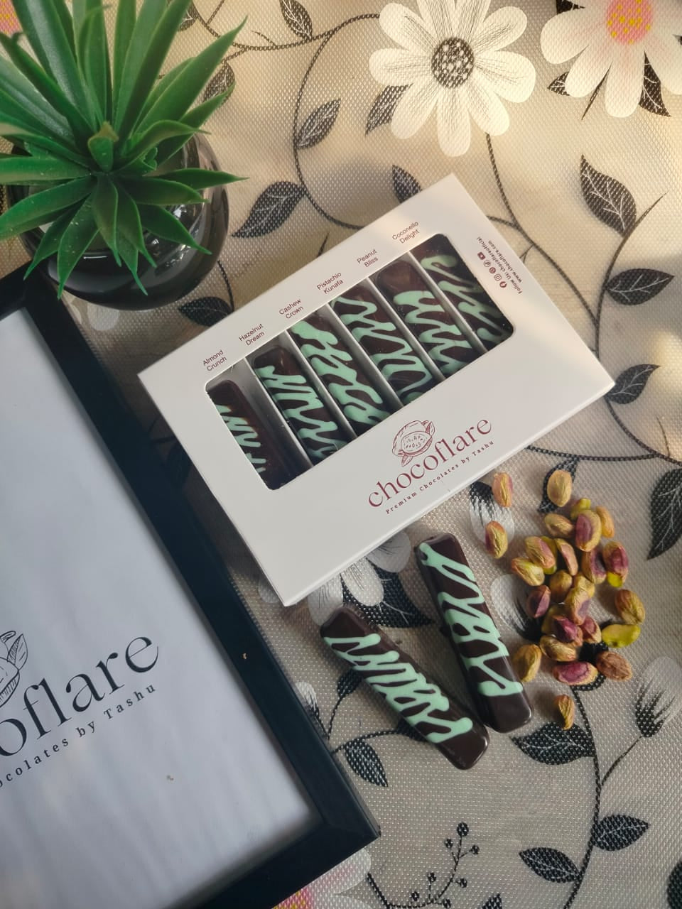 Discover the magic of Pistachio Kunafa by Choco Flare. This exquisite dark chocolate creation features a luscious pistachio kunafa center that melts into pure bliss. The crispy, golden kunafa layers blend seamlessly with creamy pistachio filling, all enrobed in rich dark chocolate. Each piece is a sensory journey nutty, sweet, and utterly irresistible. Elevate your chocolate experience with this Middle Eastern-inspired delicacy.